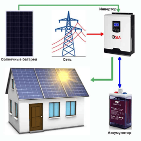 Стандартный комплекс электростанции в обязательном порядке включает в себя солнечную батарею и инвертор, аккумуляторное устройство вместе с модулем параллельного подключения.